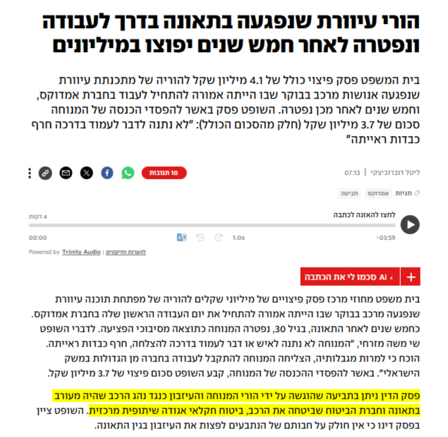 הורי עיוורת שנפגעה בתאונה בדרך לעבודה ונפטרה לאחר חמש שנים יפוצו במיליונים
